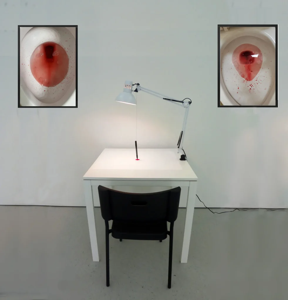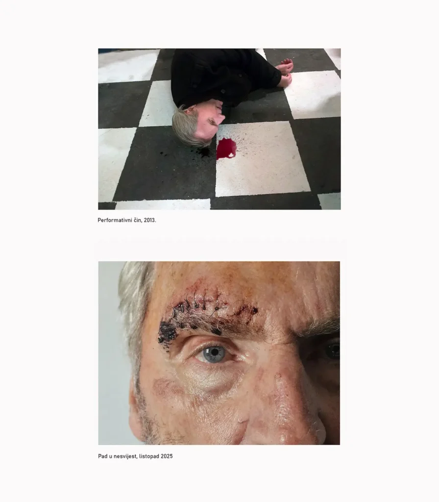 No, kako zbog još uvijek nestabilnog zdravstvenog stanja moram odustati od izvedbe ovog performance-a odlučio sam izložiti razlog tog mojeg odustanka od već dogovorenog plana. Umjesto toga želim, dakle, napraviti izložbu koja dokumentira događaj sa Tahitija i njegovu dvoznačnost priznajući činjenicu da sam (iako sebe doživljavam ponajprije umjetnikom) čovjek od krvi i mesa. Na izložbi bih izložio fotografije i videa snimljene na Tahitiju za vrijeme stanja užitka u njegovim ljepotama pomiješane s dokumentacijom o teškom tjelesnom stanju kroz koje sam prolazio (bolnički nalazi, foto wc školjke crvene od krvavog urina, krvava, na Tahitiju kupljena majica i fotka razbijene glave, bolnički kateter, bolnička piđama, krvlju popišane gaće…). Flomaster obješen o stolnu lampu u instalaciji Artist at Work (1980.) sada će na papir umjesto crne ispuštati crvenu boju, repliku Maljevičevog crvenog kvadrata nacrtati ću krvlju, Obrnuto položen „Duchampov“ pisoar biti će ispunjen krvavo crvenom bojom…